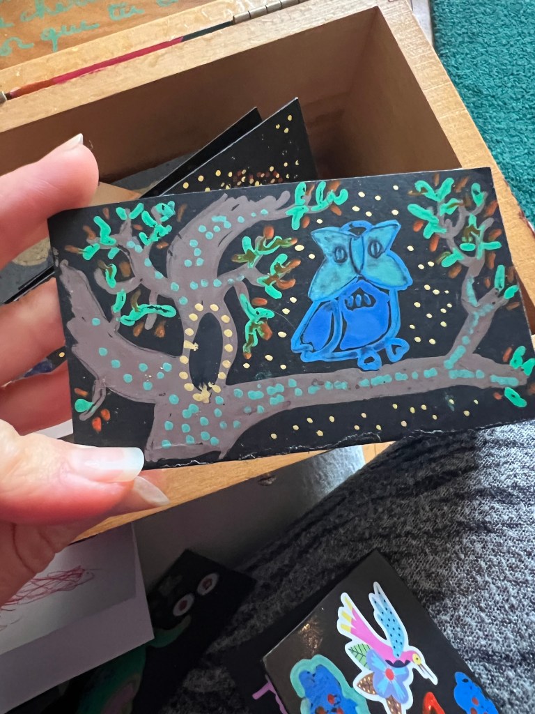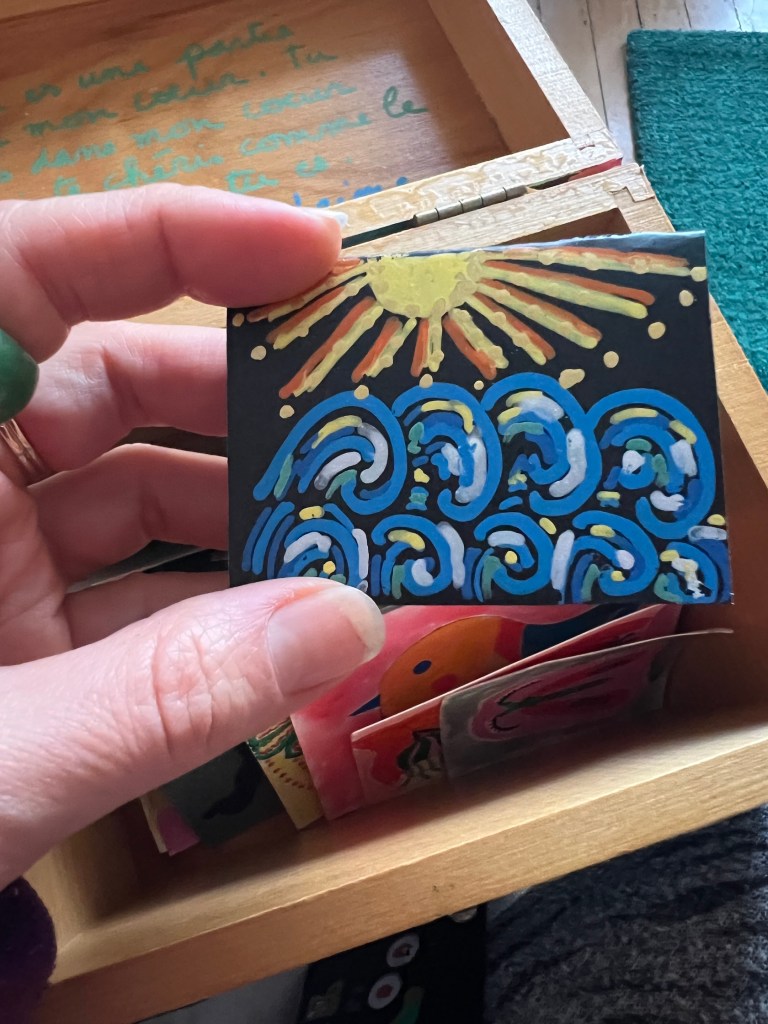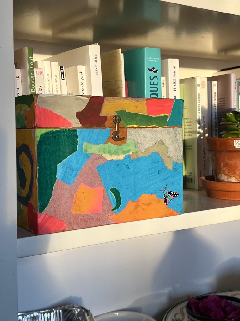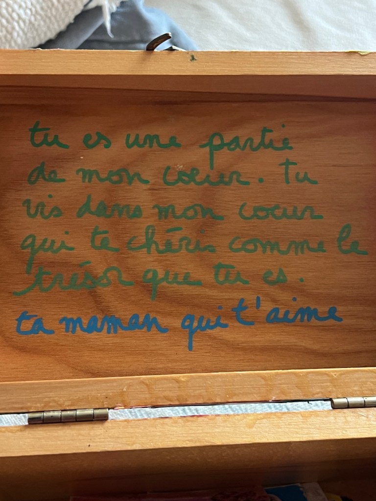 Alors, j’ai créé une boîte remplie de petits papiers colorés pour conserver tous les dessins et mots qu’il reçoit chaque jour. Et je prends un plaisir fou à ces petites créations quotidiennes.