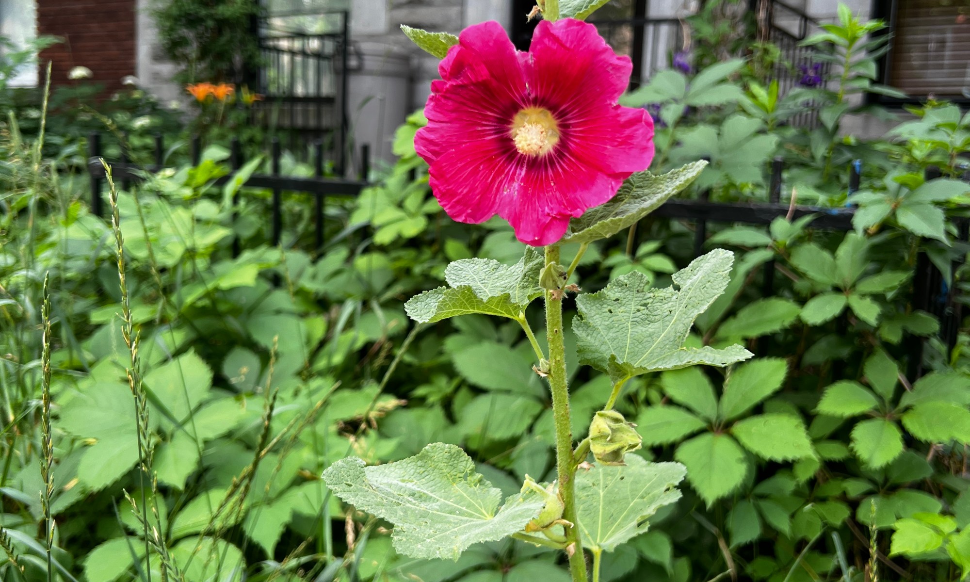 Je suis de retour à MontréalAprès presque deux mois passés en Crète.Voyage qui a suivi une séparation difficile Avec le père de Yuri. J’appréhendais Le retour au Québec.Et voilà que juste à côté Des marches de l’escalier De mon chez moi,Je suis accueillie Par l’une de mes fleurs préférées:La rose trémière…  Jamais une de ces fleurs n’a poussé Devant chez nous..  …